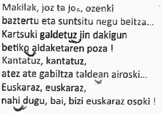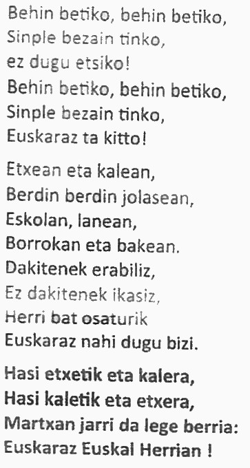 Araban bagare, Gipuzkun bagera, Guztiok gara euskaldun, guztiok anaiak gara Araban bagare, Gipuzkun bagera, Herri bat dugu osatzen, eta gure zabarkeriz |