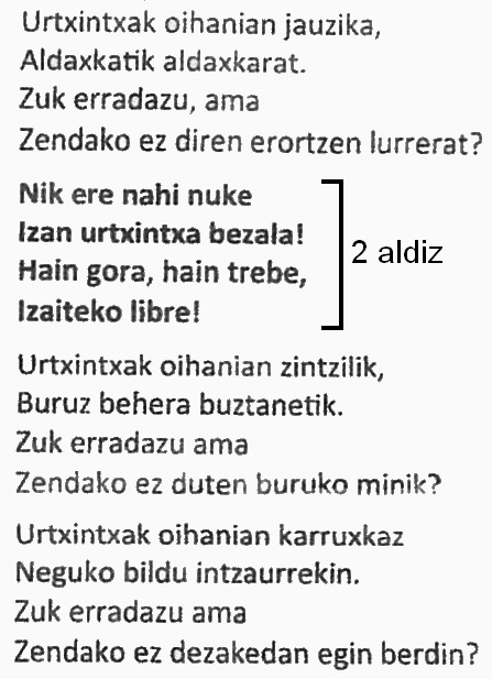Hegoak ebaki banizkio, Hegoak ebaki banizkio, Bainan honela, ez zen gehiago xoria izango Hegoak ebaki banizkio, Bainan honela, ez zen gehiago xoria izango Rai la, la la la la la la la la... Ria la, Ria la, Riaa laaa. |